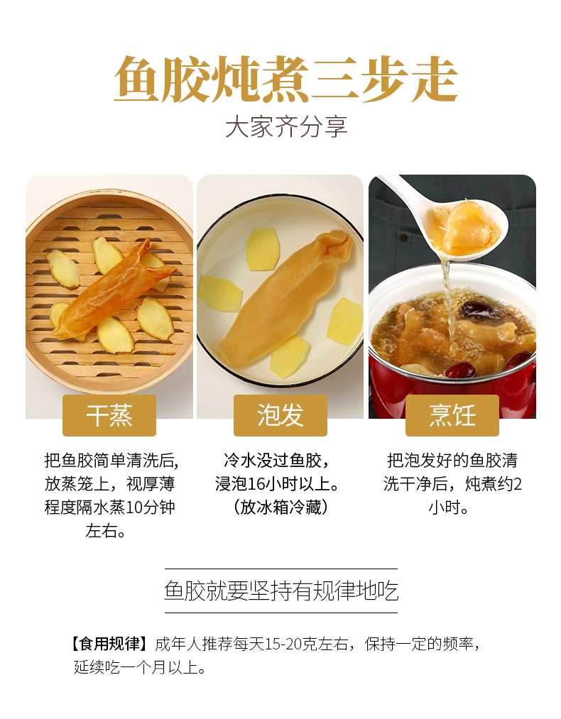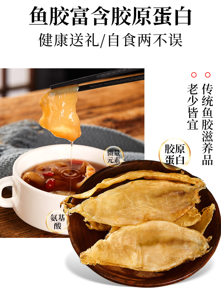 花膠即魚肚,是各類魚鰾的干制品,以富有膠質而著名,故名為花膠。花膠又名魚肚,是從魚腹中取出魚鰾,切開曬干后而成?;z含有豐富的蛋白質、膠質等,食療有滋陰養(yǎng)顏、固腎培精之效,可令人迅速消除疲勞。頂級魚肚排名依次是魚膠之王:金錢鳘魚膠、白花膠、黃鱘膠、黃花膠、鳘魚膠?;z不僅是筵席名菜,還有相當?shù)淖萄a價值。